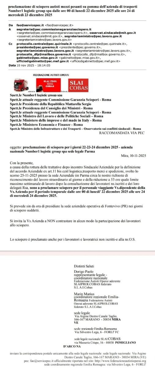 Proclamazione sciopero per il 22-24 dicembre 2025 alla Number1 logistics group di Parma dopo infruttuosa trattativa, contro l'accordo aziendale di forfettizzazione (5 minuti al giorno di straordinario !!!) sottoscritto dai "sindacati" confederali Filt e Fit. clicca qui